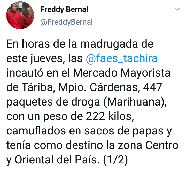 Freddy Bernal protector del está Tachira anunció que en un mercado mayorista se encontraban camuflados en sacos de papas paquetes de droga, con destino a la zona Centro y Oriental del país.