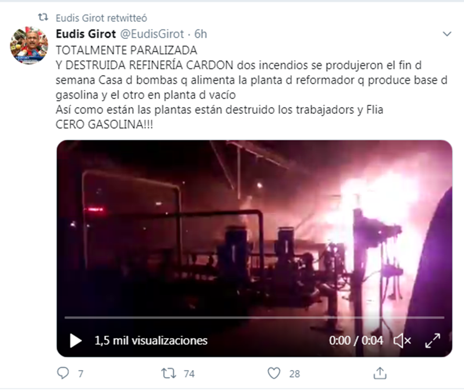 Aunado a esto, Girot aseguró que, durante el fin de semana ocurrieron dos incendios en el lugar; uno en la casa de bombas que realiza la labor de alimentar la planta de reformador que produce la base de gasolina y el otro en la planta de vacío.