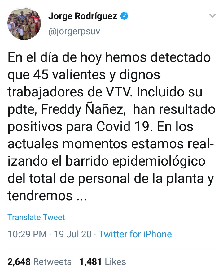 Jorge Rodríguez Ministro de Comunicación y de Información informó que en la planta televisiva Venezolana de Televisión 45 empleados resultaron positivos con el COVID-19 al igual que su presidente Freddy Ñañez.