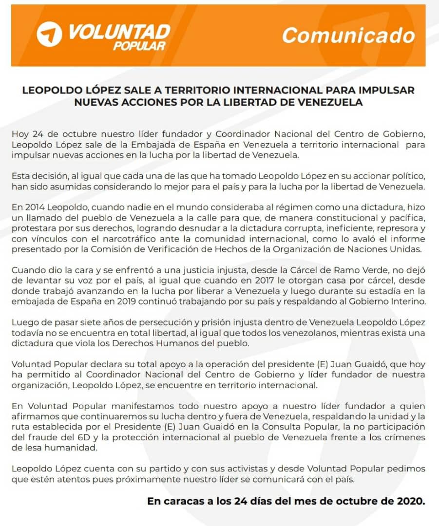 Manuela Bolívar, diputada a la Asamblea Nacional por el estado Miranda colgó en su cuenta de la red social Twitter un comunicado en el que la directiva del partido político Voluntad Popular informa que la salida de Leopoldo López hacia territorio internacional es para impulsar nuevas acciones en la lucha por la libertad de la nación.